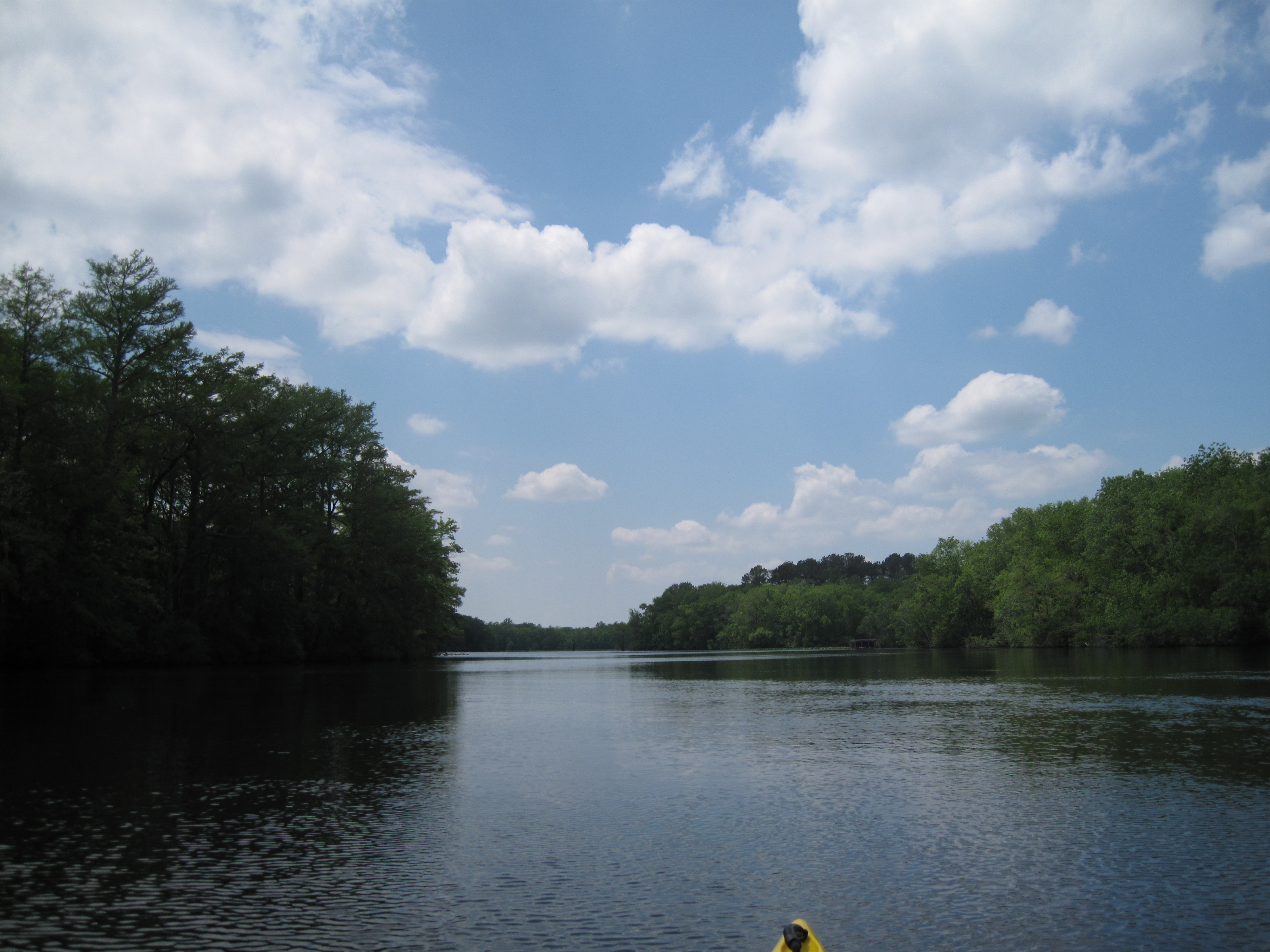 Two miles south of Snow Hill the mouth of Nassawango Creek opens up on the right. Different from other paddling locations in this area both the Pocomoke and Nassawango Creek are bordered by hard wood forests to the shore line. Paddling close to shore one quickly realizes in times of high water a hardwood swamp often extends quite a distance into the forest. Several miles up Nassawango Creek Cypress trees become more predominant. While song birds are quite numerous in this area, very few water birds exist. The water is dark and limits their ability to fish.