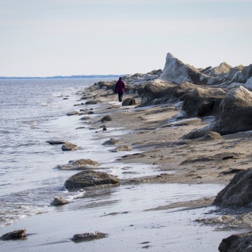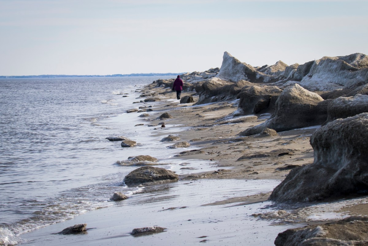 ‘20180109_142535_Judy walking among the ice blocks washed up on Broadkill Beach’