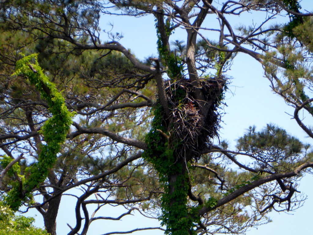 We paddled along the edge of Hog Island crossing over to Hudson Landing where a second bald eagle appeared in a pine tree. Shortly thereafter we spied a large eagle’s nest. The nest seems deserted or at least we detected no activity.