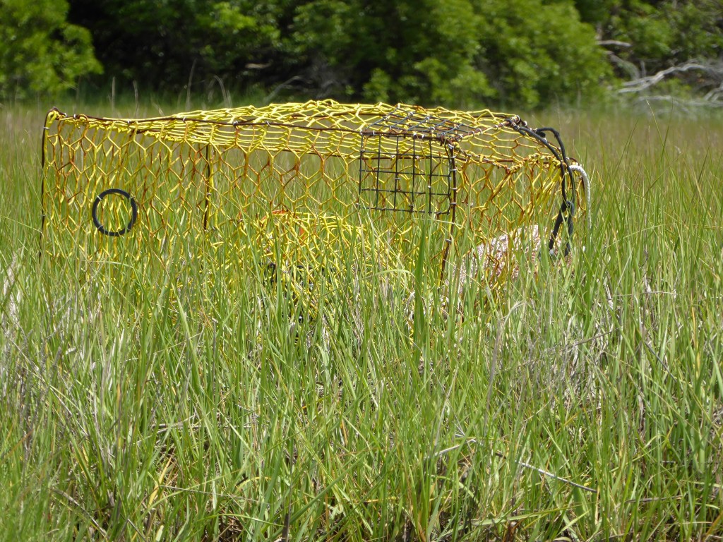 As we paddled along the marsh of Hudson Landing several willets ran through the marsh grass. Numerous crab pots rested where they obviously blew ashore.