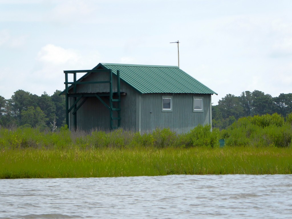 The put-in at Hammock Landing sports some large docks, a shack and some holding tanks, which are probably soft-shell peeler tanks. The first point to the east of the launch is Dick’s Point. Once we rounded Dick’s Point, the conditions became more tolerable allowing us to explore Messongo Creek and some offshoots. This green roofed structure, which appeared to be some type of duck blink, appeared on the shore in the first large cove. Several small guts allowed us an opportunity to paddle calmer waters, while examining the pine trees with binoculars looking for bald eagles.One bald eagle flew overhead later in the trip, but early on we did find an eagle’s nest hidden in a pine grove.About two miles from Hammock Landing there is another boat put-in at the end of Marsh Market Road, a handy place to take a breakShortly after passing Marsh Market Road, Messongo Creeks narrows down significantly and is lined with tall marsh grass.The marsh grass was full of songbirds, including this female red-winged blackbird who seemed bemused by our passing.After narrowing, Messongo Creek continues through numerous horseshoe curves with banks continually lined by tall grass.A green heron chirped at us and seemed annoyed at our passing.About four miles into the marsh we decided to turn back towards Hammock Landing. Paddling back towards the landing several dozen laughing gulls flew slowly up and down the creek while looking at the water intently. The tide was lowering at this point and they seemed to be fishing, but never actually dove into the water. They weren’t bothered by us and sometimes flew slowly just six feet over our heads. We made a brief stop at Marsh Market Road for a rest and a snack as we knew we would shortly be facing the wind again. After leaving this landing the wind and waves made paddling a real struggle returning to Hammock LandingHere is a map of our out and back voyage.