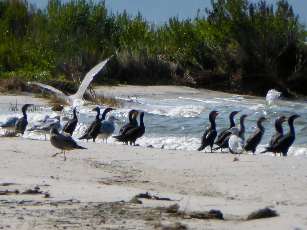 An entourage of birds greeted us as we launched from the public boat ramp. We highly recommend the soft shelled crabs at Captain E’s Hurricane Bar and Grill next to the boat ramp. Leaving Saxis one paddles by the seawall and turns left into Drum BayOn today’s journey we paddled to the far end of Drum Bay and walked the beach exploring. Heading up the beach we passed by the remains of an old dock.A large grouping of cormorants were clucking at the crashing waves.Enjoying the many stretches of scenic sand beaches around Drum Bay. Returning to our kayaks we circumnavigated Drum BayA flock of brown pelicans. We found some passage ways and decided to explore. From the GPS map it looked like we would eventually hit a dead end but we decided to go for it.The passageway through the marsh grass got narrower and narrower until it was barely as wide as our kayaks. It eventually hit a dead end inside a large pond with no outlet. The GPS was right. After hitting the dead end we backtracked the way we had come and found our way into Saxis once more.This map from our GPS shows our meandering adventure. It was a beautiful day for a nice paddle.