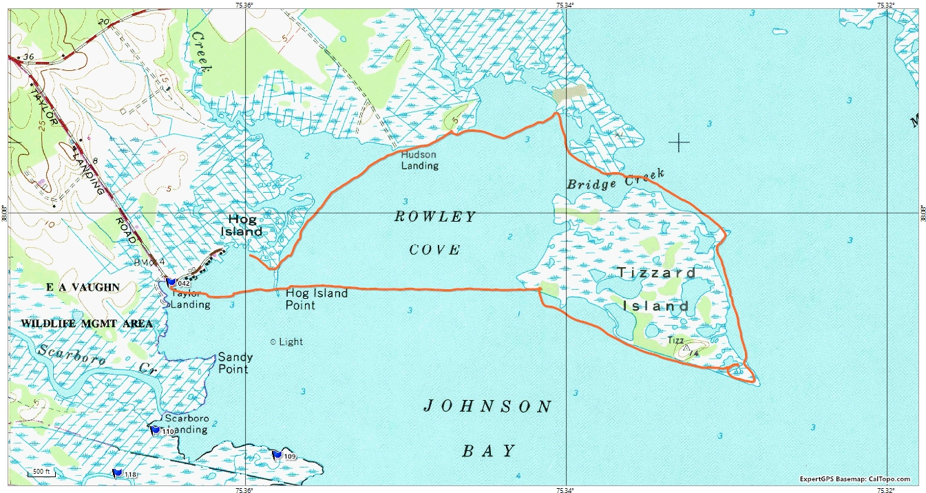 Located between Johnson Bay and Brockatonorton Bay, Tizzard Island offers excellent paddling choices, nice sandy beaches and birds. The closest put in is at the Taylor’s Landing Boat Ramp near Girdletree, MD. We kayak more from this location than any other. The options are varied; kayak to and around Tizzard and Mills Islands, up into Pike or Scarborough Creek.